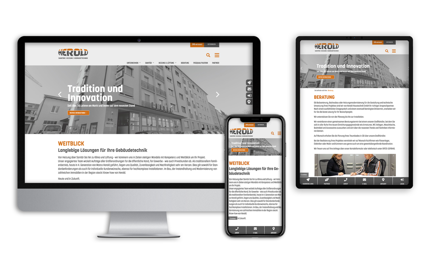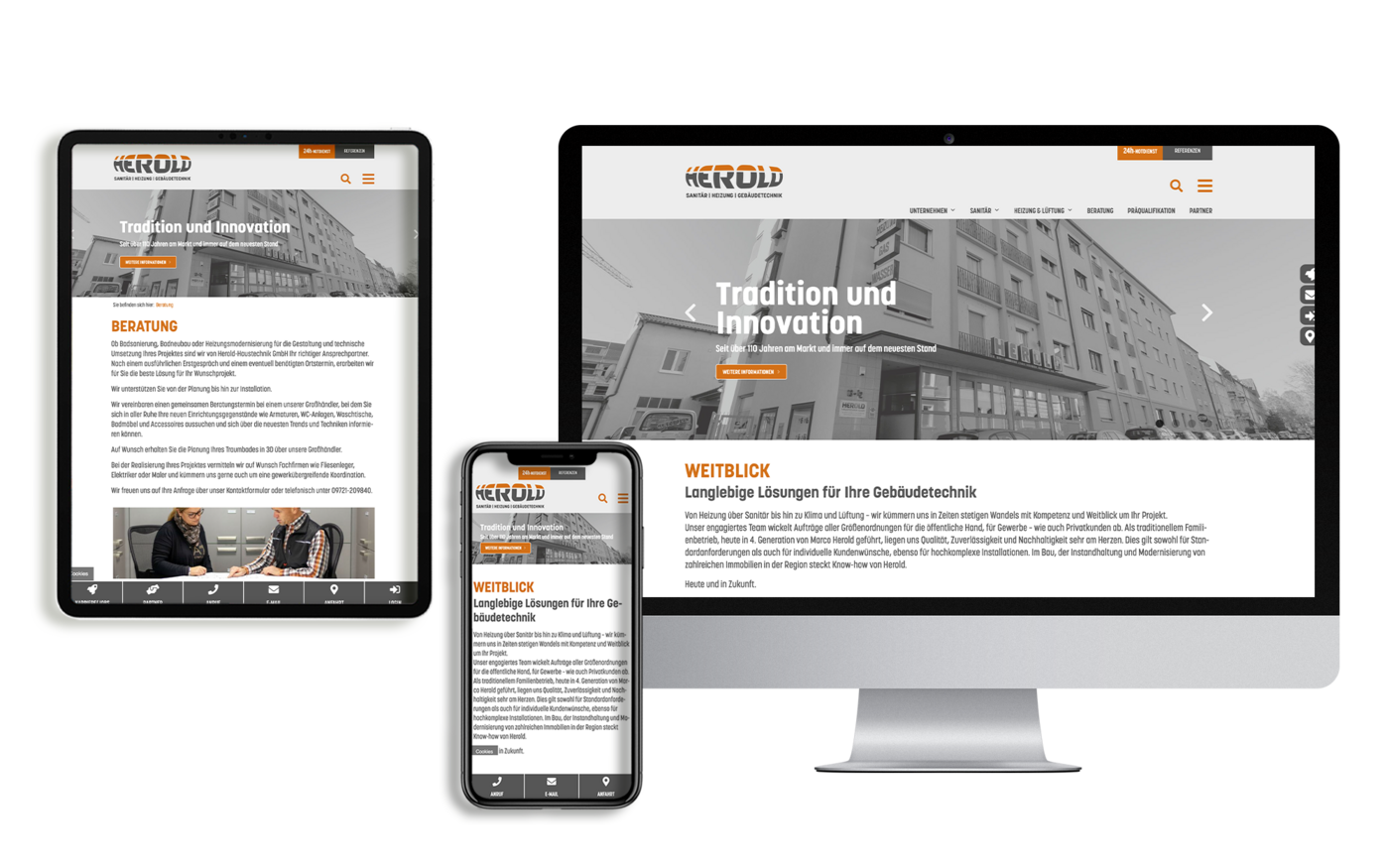 Tradition und Innovation bilden die Grundlage des Markenauftritts der Herold Haustechnik GmbH. Diese Werte spiegeln sich sowohl im neu entwickelten Logo als auch im digitalen Auftritt des Unternehmens wider. Die von uns realisierte Website verbindet handwerkliche Kompetenz mit einem modernen Erscheinungsbild und präsentiert die Leistungen klar, übersichtlich und zeitgemäß.