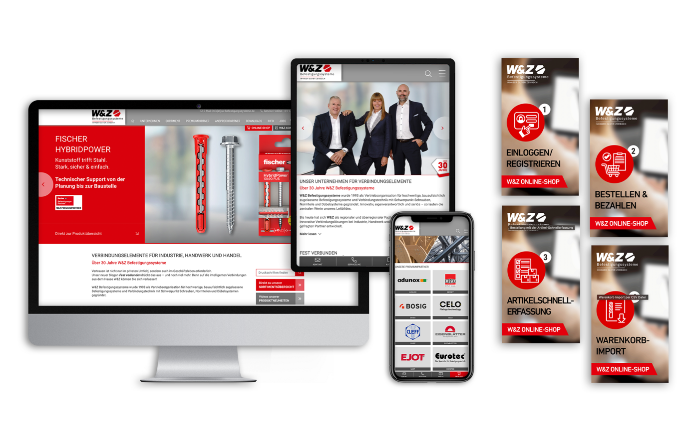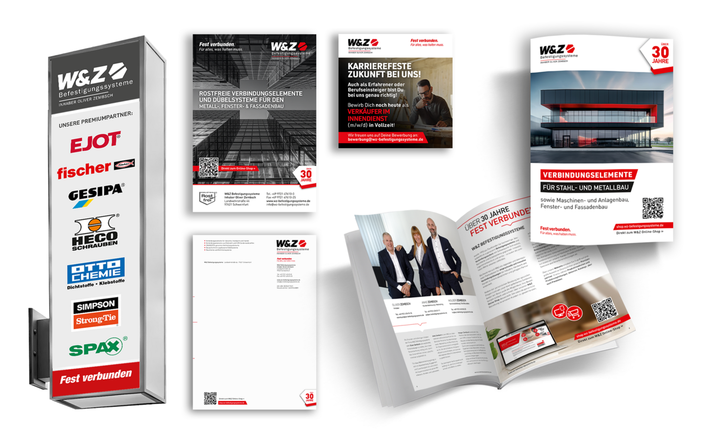 Für die Firma W&Z Befestigungssysteme - Inhaber Oliver Zembsch haben wir ein umfassendes Marketing- und Designpaket realisiert. Neben der Entwicklung eines vollständigen Erscheinungsbildes (CI/CD) für das Unternehmen, sind wir auch für die Gestaltung und Pflege der Webseite, inklusive gezielter Suchmaschinen-Optimierung verantwortlich.
